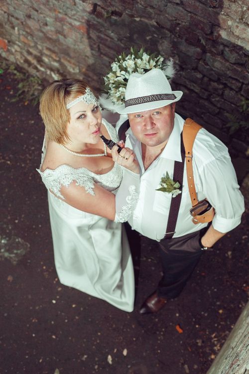 Образ жениха Белый Рубашка Черный Брюки Подтяжки Шляпа