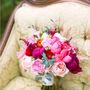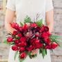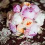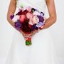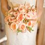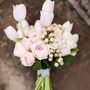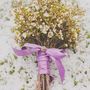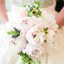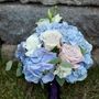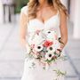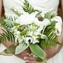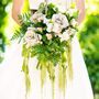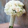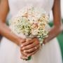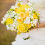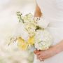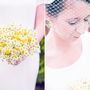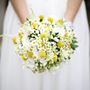 Невеста в белом пышном платье с букетом невесты в руках. Букет из белых ромашек, белых эустом и желтых краспедий