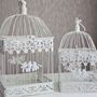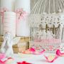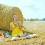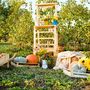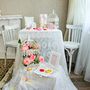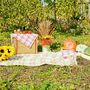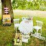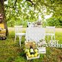 На фоне лесной зелени, стоит белый стол со стульями, коробка с фруктами и вином и белая табличка