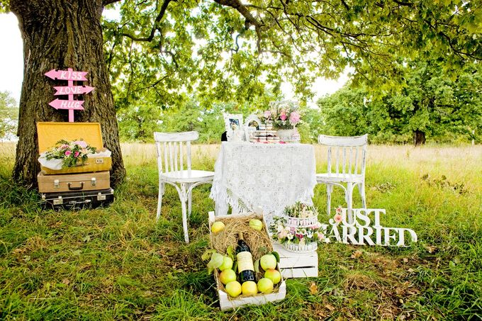 На фоне лесной зелени, стоит белый стол со стульями, коробка с фруктами и вином и белая табличка