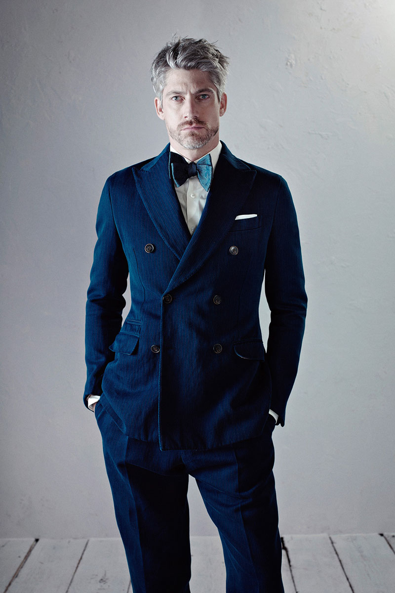 Тёмно-синий костюм двойка с белым нагрудным платком, белой рубашкой с голубым галстуком-бабочкой