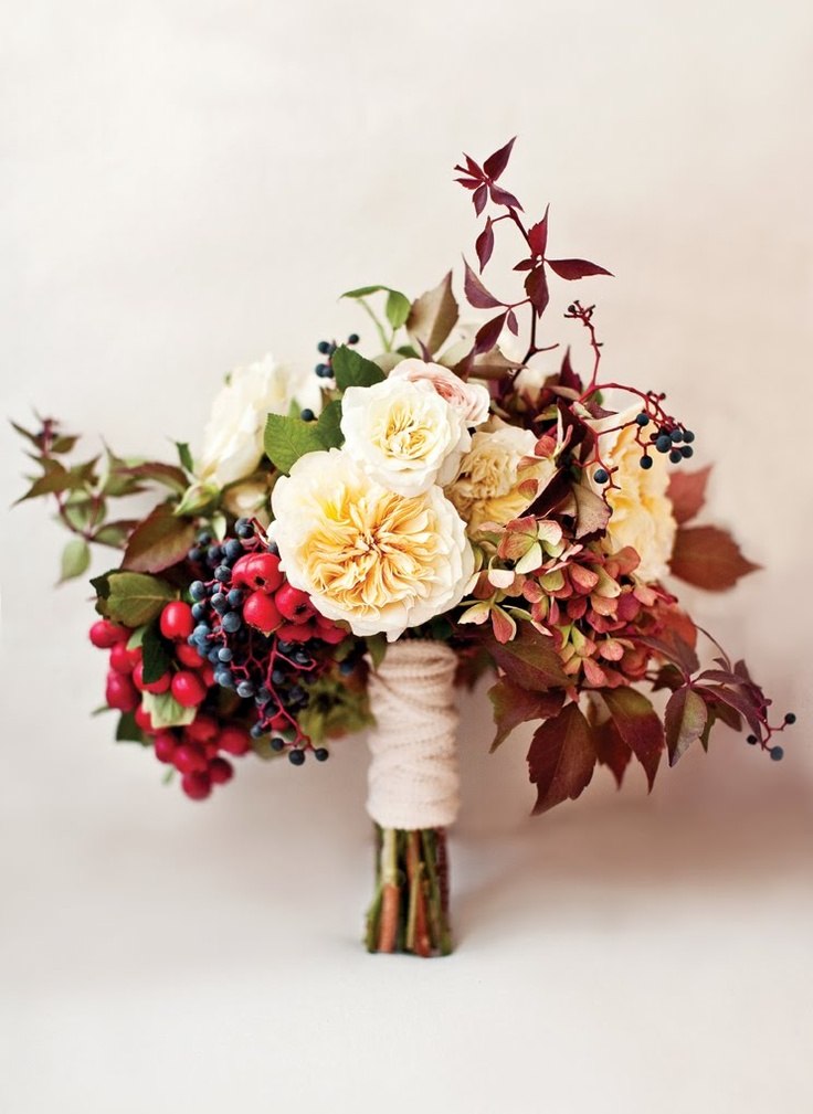 Букет невесты из белых пионовидных роз, красных и черных ягод, бордово-зеленых кустовых веточек, завязанный белой веревкой