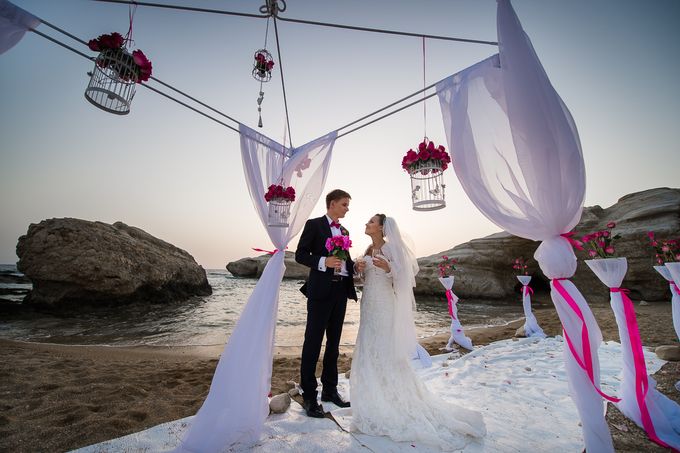 Под сводом свадебного шатра, украшенного белой газовой тканью и цветами, стоят молодожены с бокалами шампанского в руках, жених в черном костюме, невеста в длинном белом платье и фате