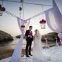Под сводом свадебного шатра, украшенного белой газовой тканью и цветами, стоят молодожены с бокалами шампанского в руках, жених в