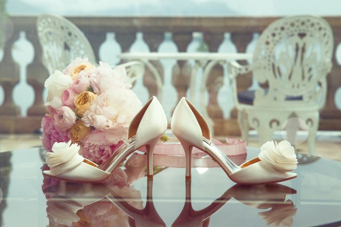 Светло-кремовые лодочки-деленки развернуты в разные стороны. Носок туфель открытый, приподнятый. Мысок декорирован крупным многослойным цветком светло-бежевого оттенка. Открытый перейменный отдел стопы. Подкладка под мысок светло-коричневая. Задник жесткий, закрытый. Соединительный ремешок отсутствует. Подкладка под задинку светло-коричневая. Внутренняя стелька рельефная серебристого цвета. Каблук высокий, форма рюмочка.Верхняя поверхность каблука светло-бежевая. фронтальная поверхность каблука коричневая. Набойки цвета молочного шоколада. Позади слева от пары лодочек невесты лежит букет невесты. Декор свадебного круглый букет в светло-кремовых тонах. Букет состоит из светло-оранжевых роз, бледно-розовых и насыщенно-розовых пионов