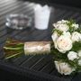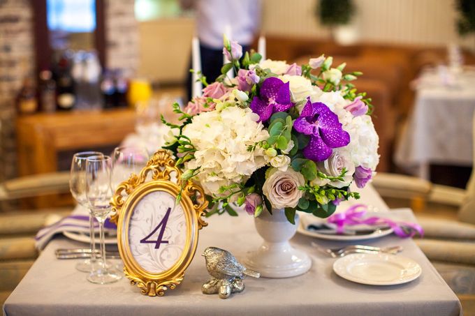 Букет из белых гортензий, орхидей Ванды,белых и лиловых роз, белых и лиловых фрезий, эвкалипта.