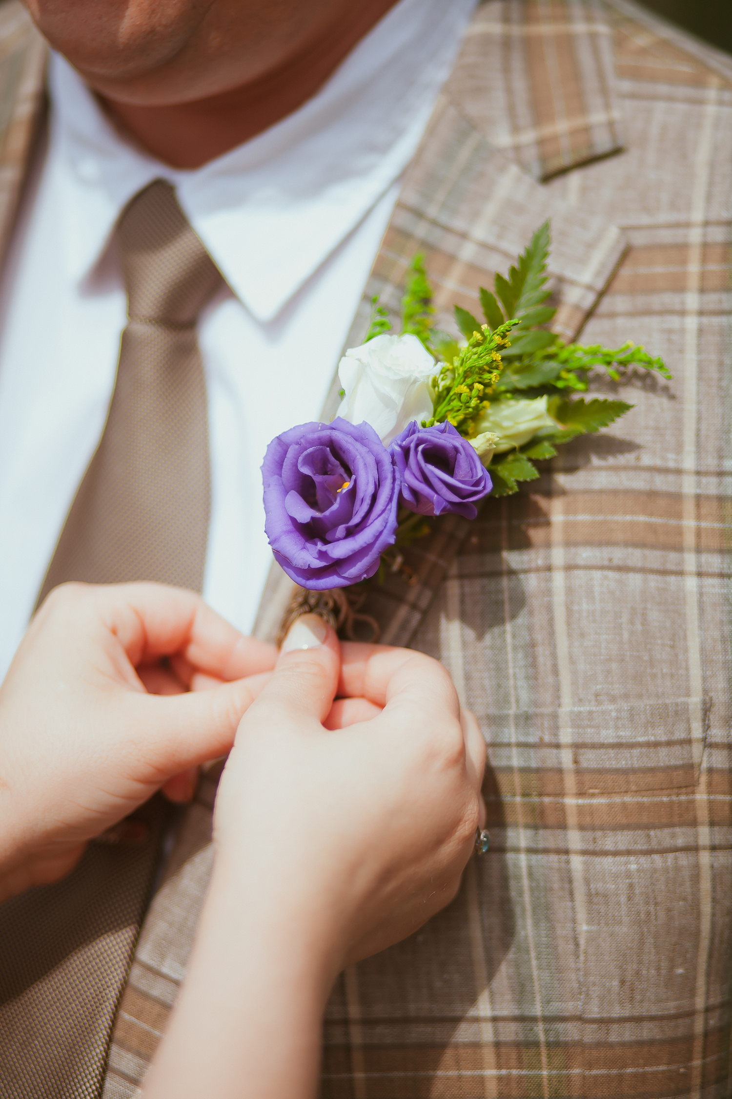 Бутоньерка из белой розы и сиреневых эустом, зеленых листьев папоротника, завязанная серой ниткой, в петлице пиджака