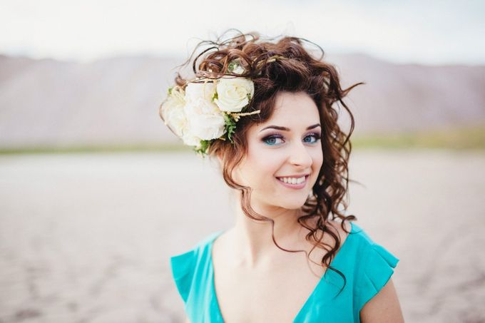 Невеста с прической из пышных локонов собранных небрежно с боку пышными белыми розами, с ярким макияжем в голубом и коричневом