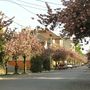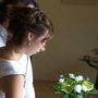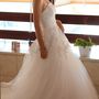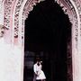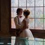 Невеста в прямом закрытом кружевном платье со шлейфом и рукавами длинной три четверти и с цветком в волосах