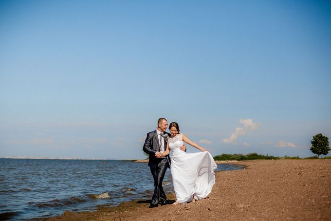 Молодая пара прогуливается по берегу моря, жених обнимает невесту за талию и ведет за руку, она же развивает по ветру свое платье.