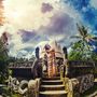Парень в белой рубашке и голубых штанах обнимает за руку и шею свою любимую, смотря ей в глаза, она одета в открытое платье с завышенной талией