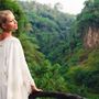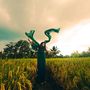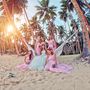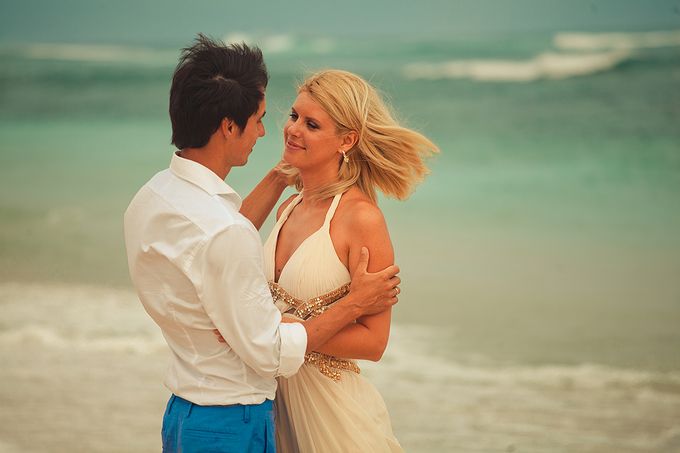 Парень в белой рубашке и голубых штанах обнимает за руку и шею свою любимую, смотря ей в глаза, она одета в открытое платье с