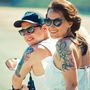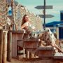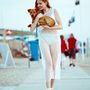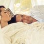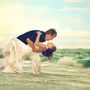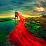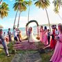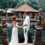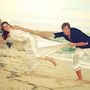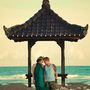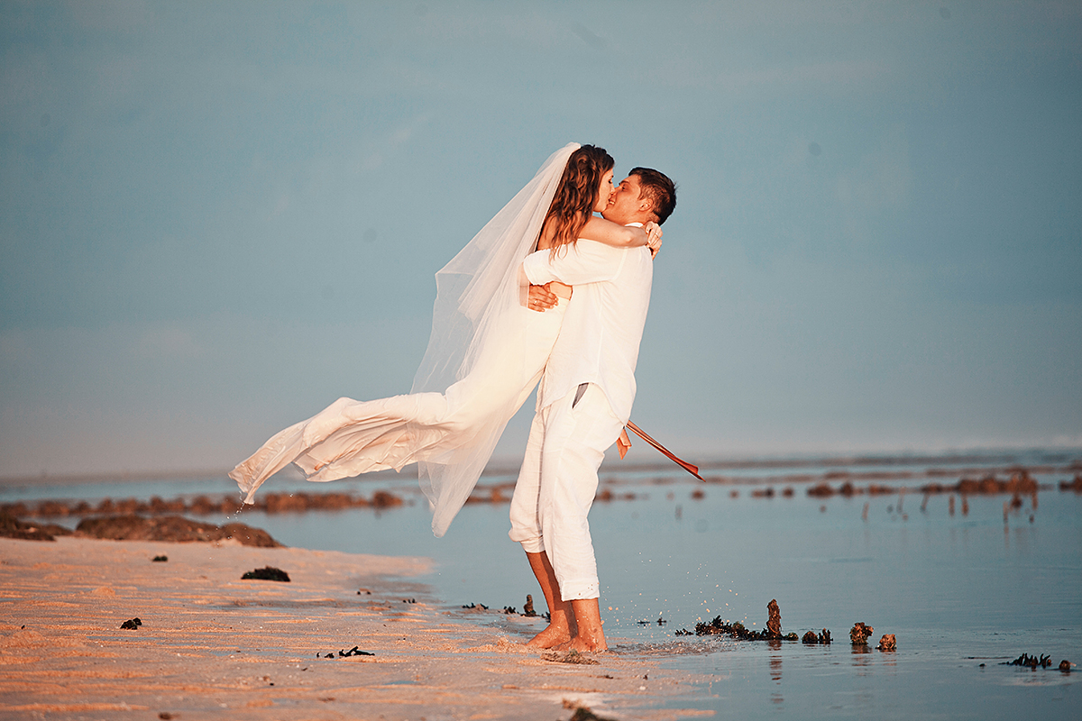 На лазурном пляже молодожены застыли в страстном поцелуе. Парень поднял девушку в воздух, она крепко обхватила его за шею.