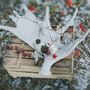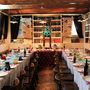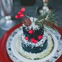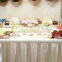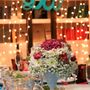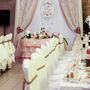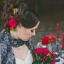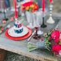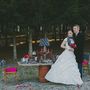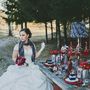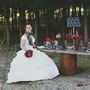 В лесу за столом, на котором стоит лампа, подсвечники с красными свечами, сладости и бокалы, сидит невеста, укутанная серым шарфом