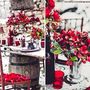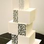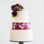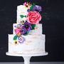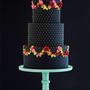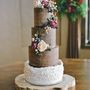 четырехъярусный торт коричневого цвета, нижней ярус белый, по торте украшено цветами.