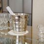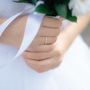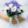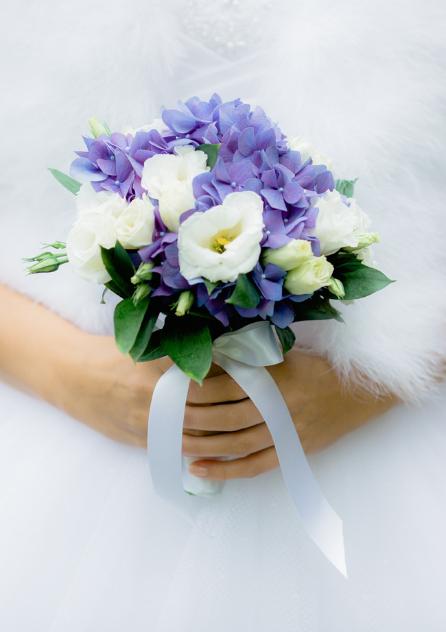 Букет невесты из белых эустом, зеленых листков и сиреневых гортензий, декорированный белой атласной лентой