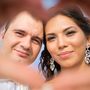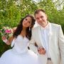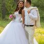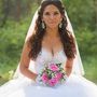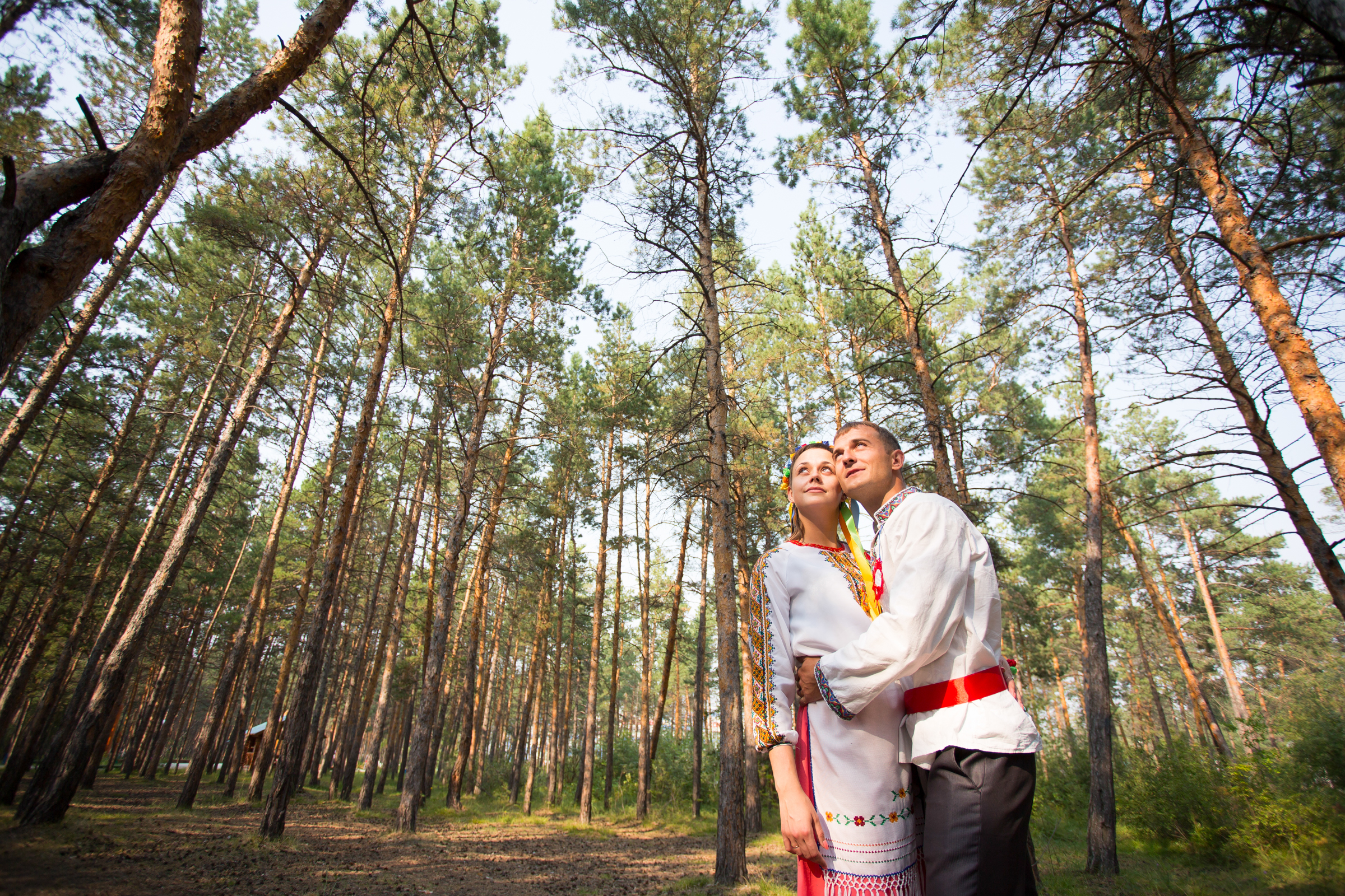 Жених и несеста стоят, обнявшись, в сосновом лесу