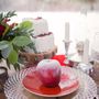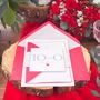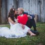 На газоне возле забора сидят жених с невестой, нежно касаясь друг друга носами и держа в руке плюшевое сердце.