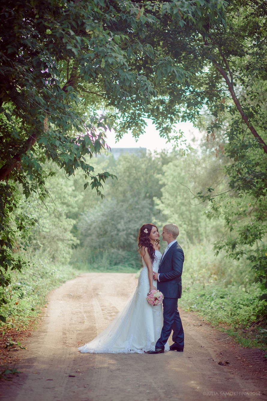 На лесной тропинки стоят молодожены, жених в темном костюме держит невесту в белом открытом платье за талию, готовясь ее поцеловать, ее волосы украшает цветок