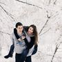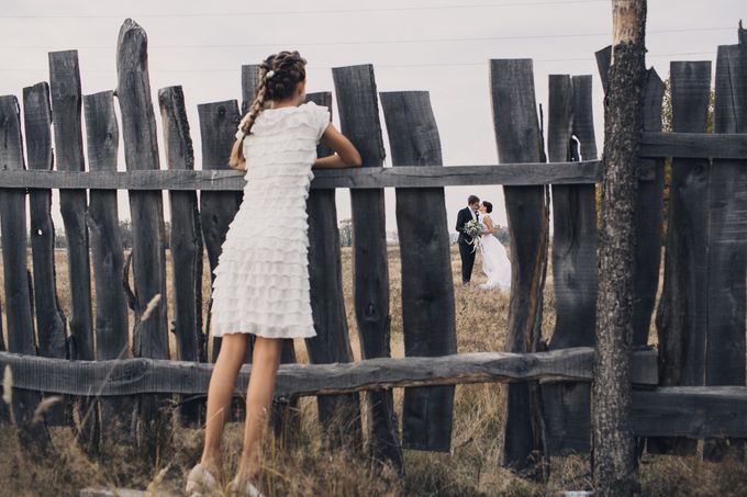 Девушка смотрит на жениха и невесту сквозь щель в заборе