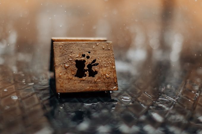 На коричневой коробочке маленький черный медвежонок и зайчик, над ними два сердечка