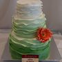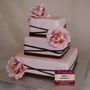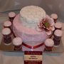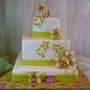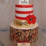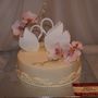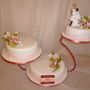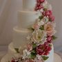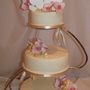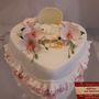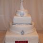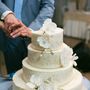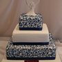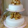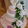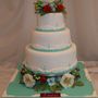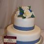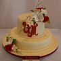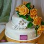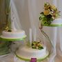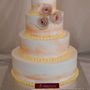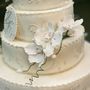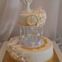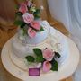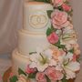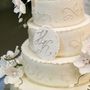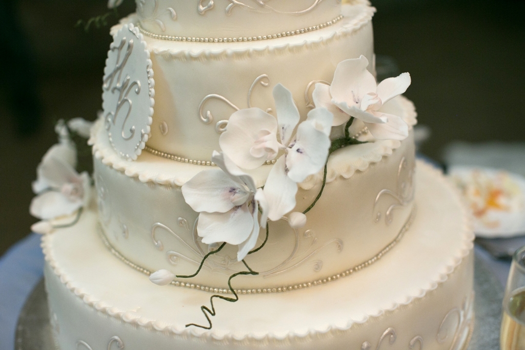 Многоярусный белый торт с узором украшен цветочками и табличкой с инициалами.