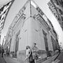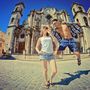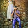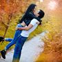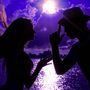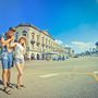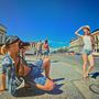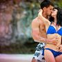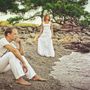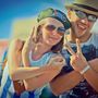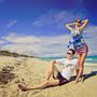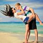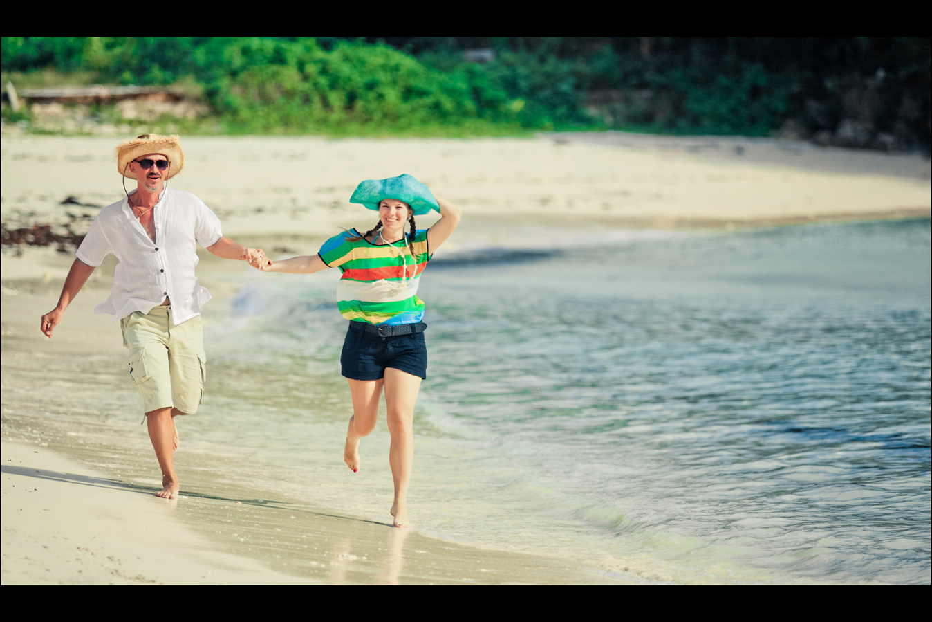 По песчаному побережью бегут влюбленные, держась за руки, девушка в темных шортах, яркой полосатой футболке придерживает бирюзовую панаму, парень в бежевых бриджах, белой рубашке и шляпе