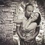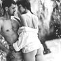 По песчаному побережью бегут влюбленные, держась за руки, девушка в темных шортах, яркой полосатой футболке придерживает