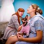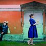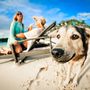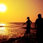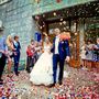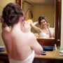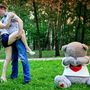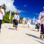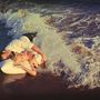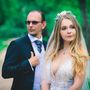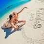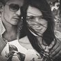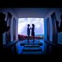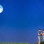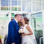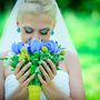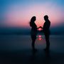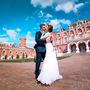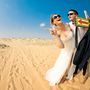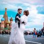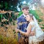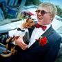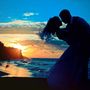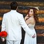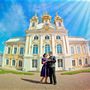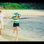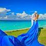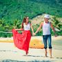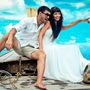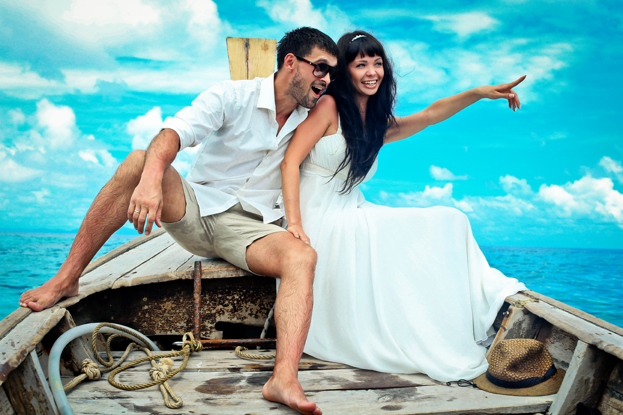 В лодке сидит парень в белой рубашке и бежевых шортах, обняв за талию невесту в открытом белом платье, которая указывает ему вдаль