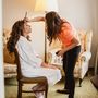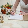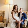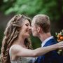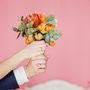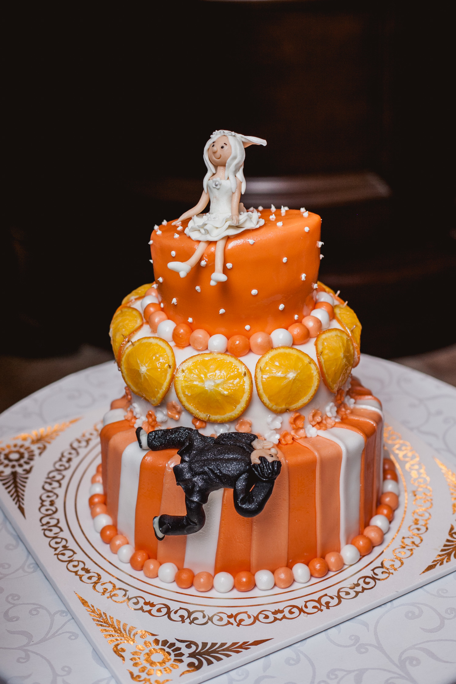 Свадебный яркий оранжево-желтый торт, украшен драже, дольками апельсина и фигурками жениха и невесты сделанных с мастики.