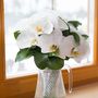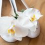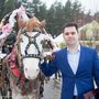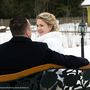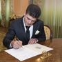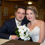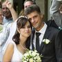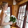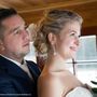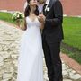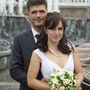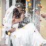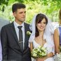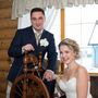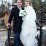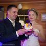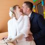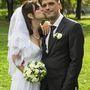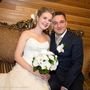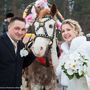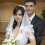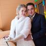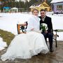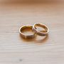 Золотые обручальные кольца, выполнены в классическом стиле с матовой окантовкой и гравировкой внутри, на фоне коричневой столешницы.