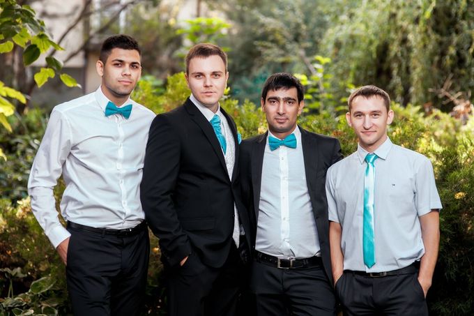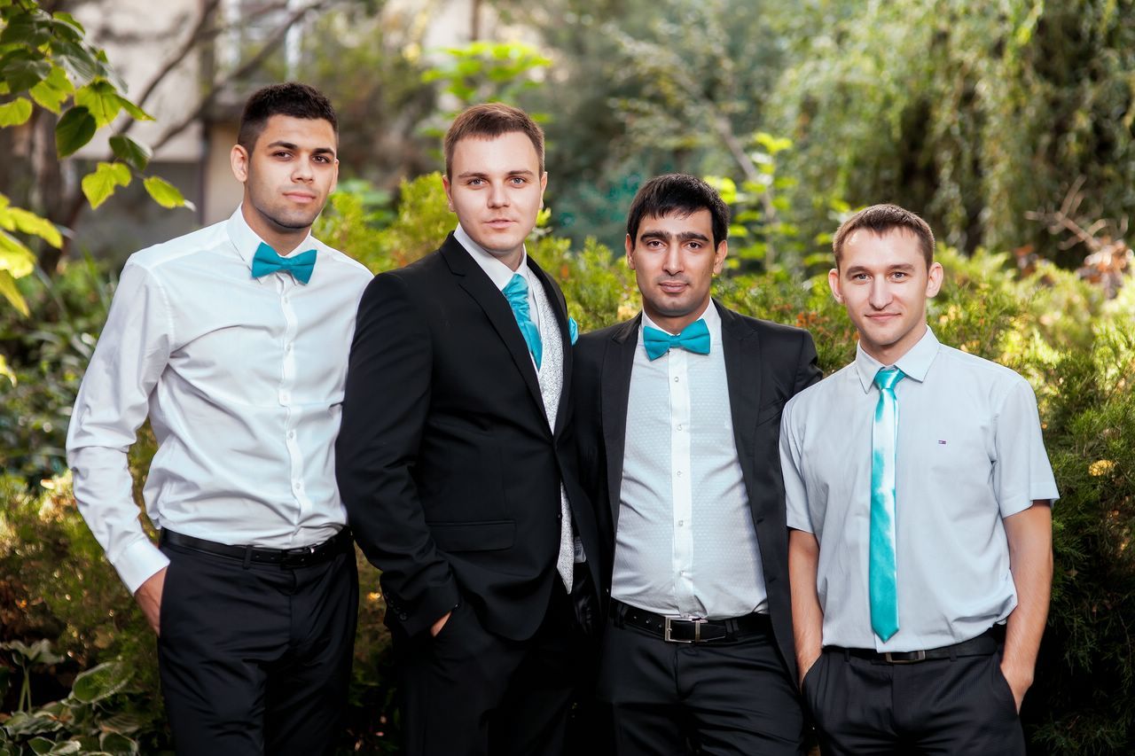 Друзья жениха стоят у красивого куста в белых рубашках с голубыми бабочками , черных брюках, двое их них с голубыми галстуками  - фото 3317759 Свадебное агентство "Эксклюзив"