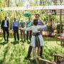 Друзья жениха стоят у красивого куста в белых рубашках с голубыми бабочками , черных брюках, двое их них с голубыми галстуками