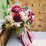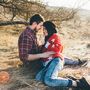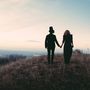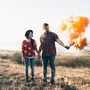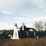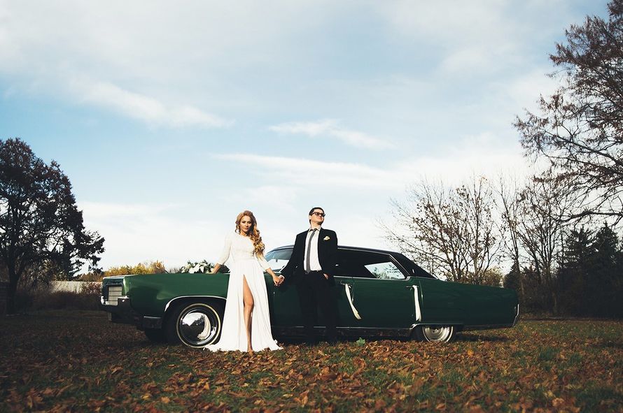 Зелёная "Волга" на фоне осеннего луга, деревьев и пары нежных молодоженов