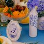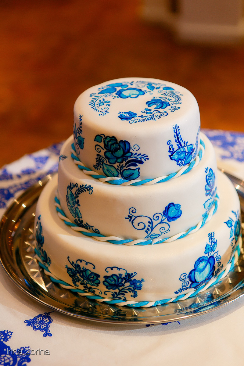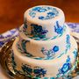 Белый трехъярусный торт украшен голубым узором.