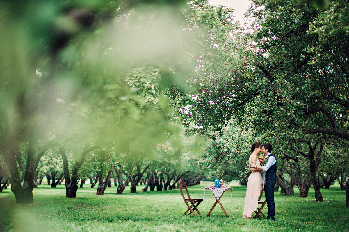Жених и невеста, прислонившись друг к другу, стоят посреди зеленого сада