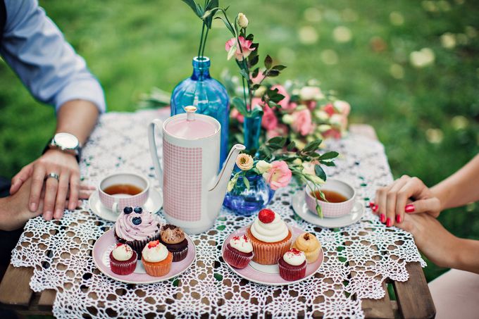 на столе прозрачная белая скатерть, на которой розовые тарелочки с пирожными, две чашки с чаем, чайник и букет цветов - фото 3398013 Фотограф Алёна Парфёнова