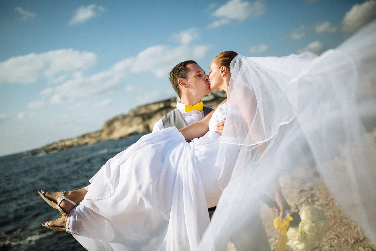 Посреди песчаного пляжа жених поднял невесту на фоне моря