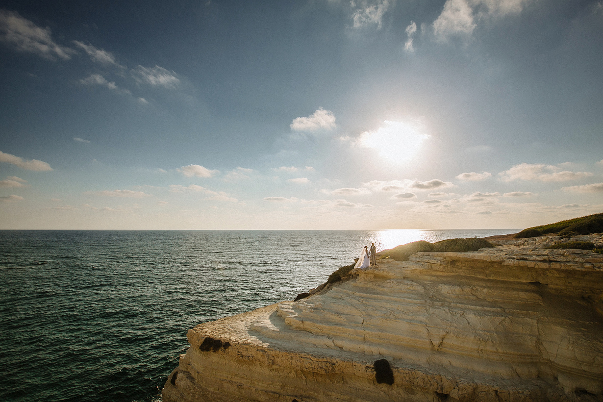 Жених и невеста, прислонившись друг к другу, стоят на пляже на фоне моря
