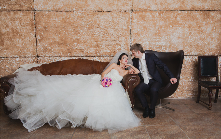 Жених сидит в черном кресле возле невесты, которая лежит на коричневом диване