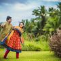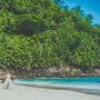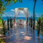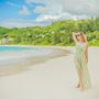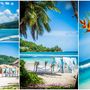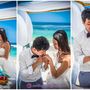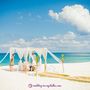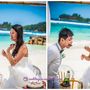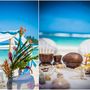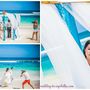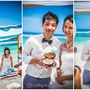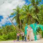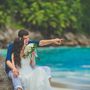 На пляже, сидят на наклонившей пальме, жених и невеста, она в белом, открытом и длинном платье, он в голубой рубашке и шортах