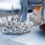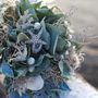 Букет невесты из серо-зеленой цинерарии, коричнево-серых сухоцветов и зеленых листьев в морском стиле, декорированный белыми жемчужными бусинами и брошью в виде морской звезды