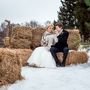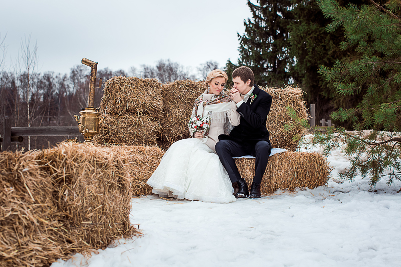 Оформление зимней фотосессии свадьбы в этническом русском стиле : невеста и жених сидят на стоге сена, рядом стоит самовар