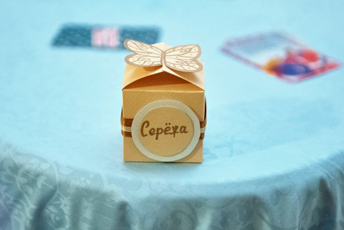 Милая коричневая бонбоньерка с именем гостя и бабочкой сверху