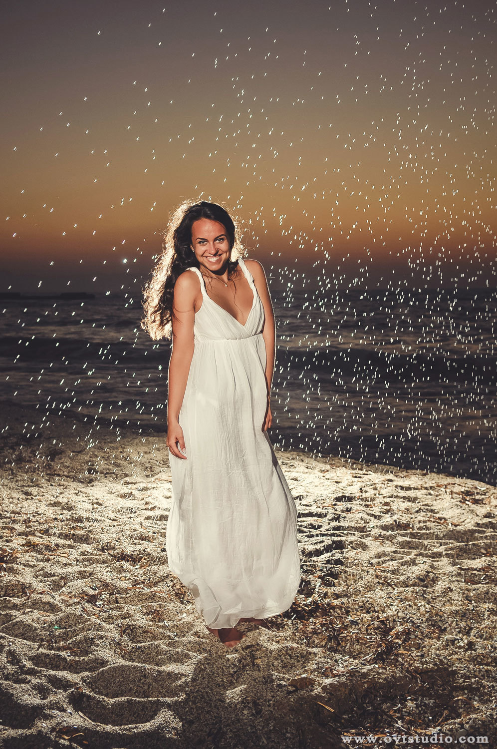 На пляже, стоит невеста в открытом, длинном платье