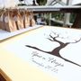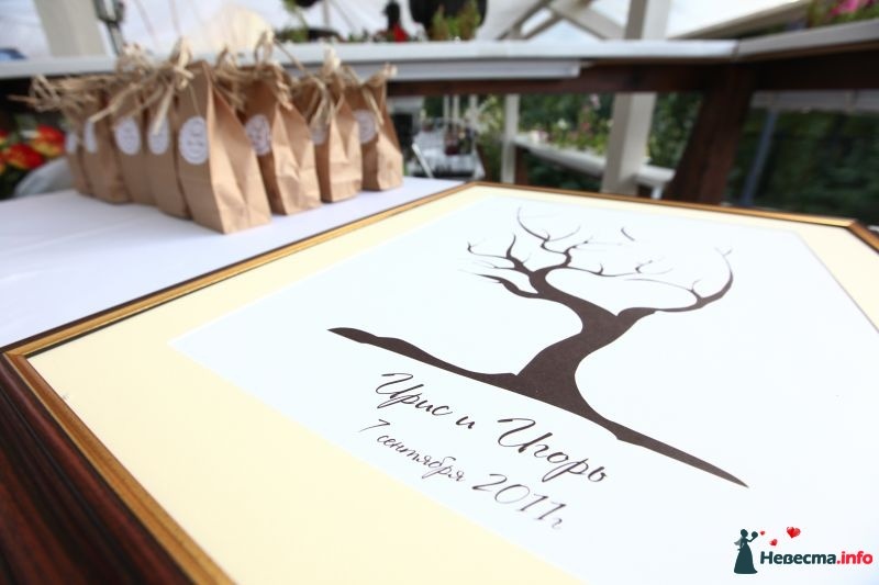 Табличка на свадьбу в виде картины в рамке, с изображением коричневого дерева-сердца, имён молодожёнов и даты бракосочетания.