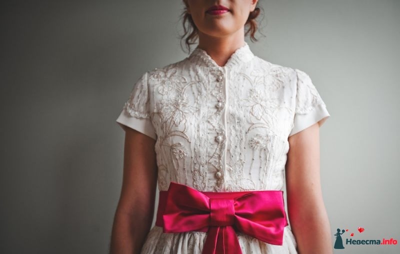 Платье невесты украсил широкий розовый атласный бант на поясе