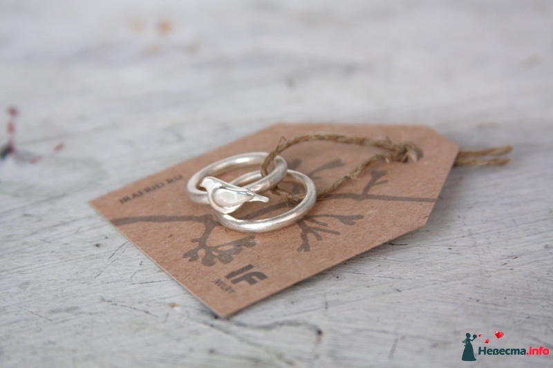 Серебряные обручальные кольца, соединенные шпагатом и этикеткой салона.Одно из колец оформлено птичкой.