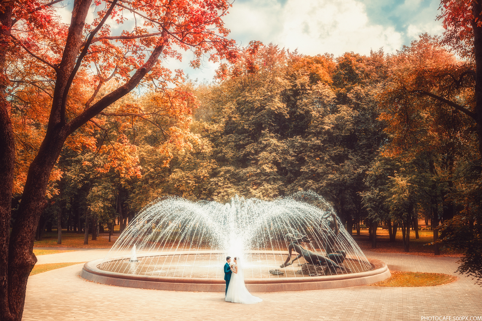 Осень. Фонтан. Город. Пара. Влюбленные. Молодожены.