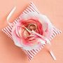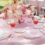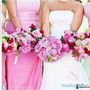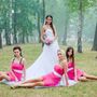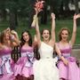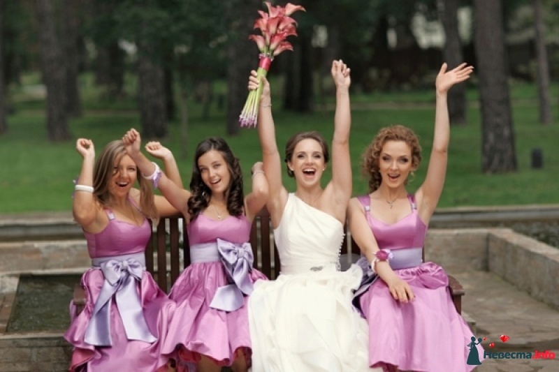 Парк. Деревянная скамеечка. Невеста с собранными волосами в белом платье с асимметричным вырезом горловины на одно плечо, подняла руки вверх в букетом из розовых кал. Её подружки в одинаковых розовых атласных платьях средней длинны с расклешенным низом на бретельках с декором, с завышенной талией и серым атласным поясом, завязанным сбоку на бант, подняли ручки с розово-белыми браслетиками. Невеста и её подружки в европейском стиле на фоне зелени парка